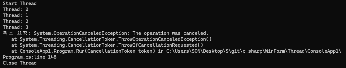 쓰레드를 종료하기 위해 CancellationToken도 자주 사용됩니다. 해당 방식은 OperationCanceledException 에러를 발생 시키므로 관리하기 더 용이합니다.