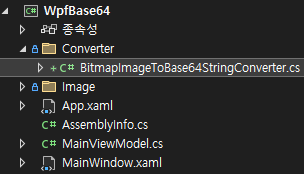그 다음 프로젝트 폴더에 Converter 폴더를 만들어 이미지와 Base64 문자를 변환해주는 BitmapImageToBase64StringConverter.cs를 만들어줍니다.