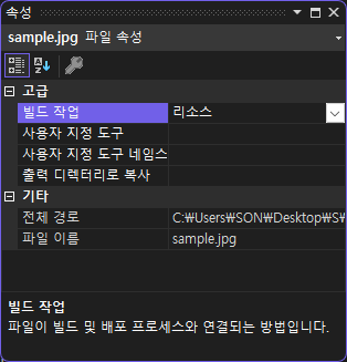 그리고 이 이미지를 우클릭 한 뒤 속성에 들어가서 빌드 작업을 리소스로 바꿔줍니다.