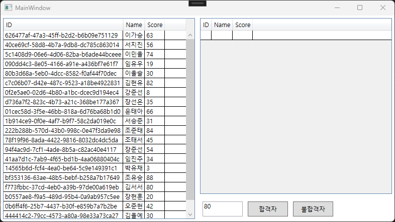 아래는 github에 올린 Func 예제 프로그램 입니다. 좌측은 전체 학생을 표시하며 ID, 학생, 점수가 표시되고, 우측엔 특정 점수를 기준으로 합격자, 불합격자를 출력하는 학생을 출력하는 프로그램입니다.
