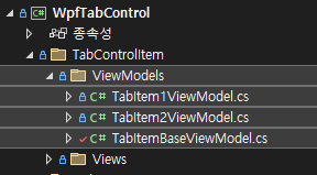 그 다음 TabItemBaseViewModel.cs, TabItem1ViewModel.cs, TabItem2ViewModel.cs파일을 만들어 줍니다.